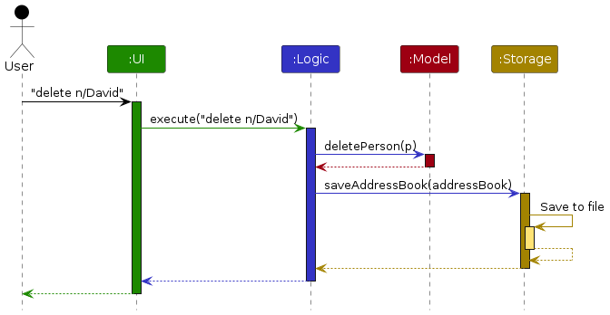 The Sequence Diagram below shows how the components interact with each other for the scenario where the user issues the command delete n/David.