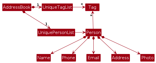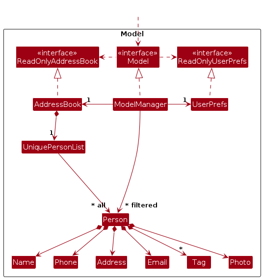 Person objects (which are contained in a UniquePersonList object).Person objects (e.g., results of a search query) as a separate filtered list which is exposed to outsiders as an unmodifiable ObservableList<Person> that can be 'observed' e.g. the UI can be bound to this list so that the UI automatically updates when the data in the list change.UserPref object that represents the user’s preferences. This is exposed to the outside as a ReadOnlyUserPref objects.Model represents data entities of the domain, they should make sense on their own without depending on other components)Note: An alternative (arguably, a more OOP) model is given below. It has a Tag list in the AddressBook, which Person references. This allows AddressBook to only require one Tag object per unique tag, instead of each Person needing their own Tag objects.